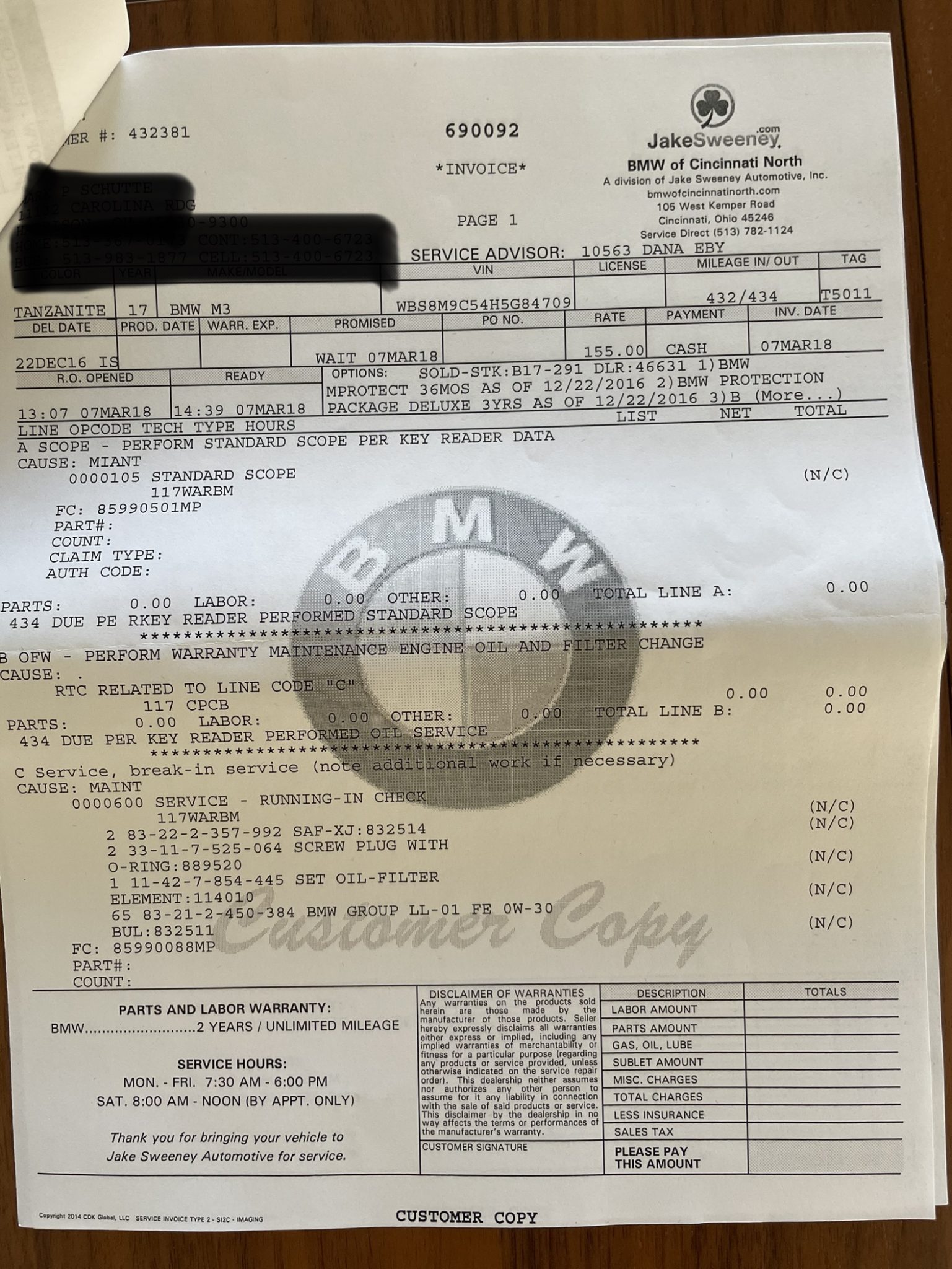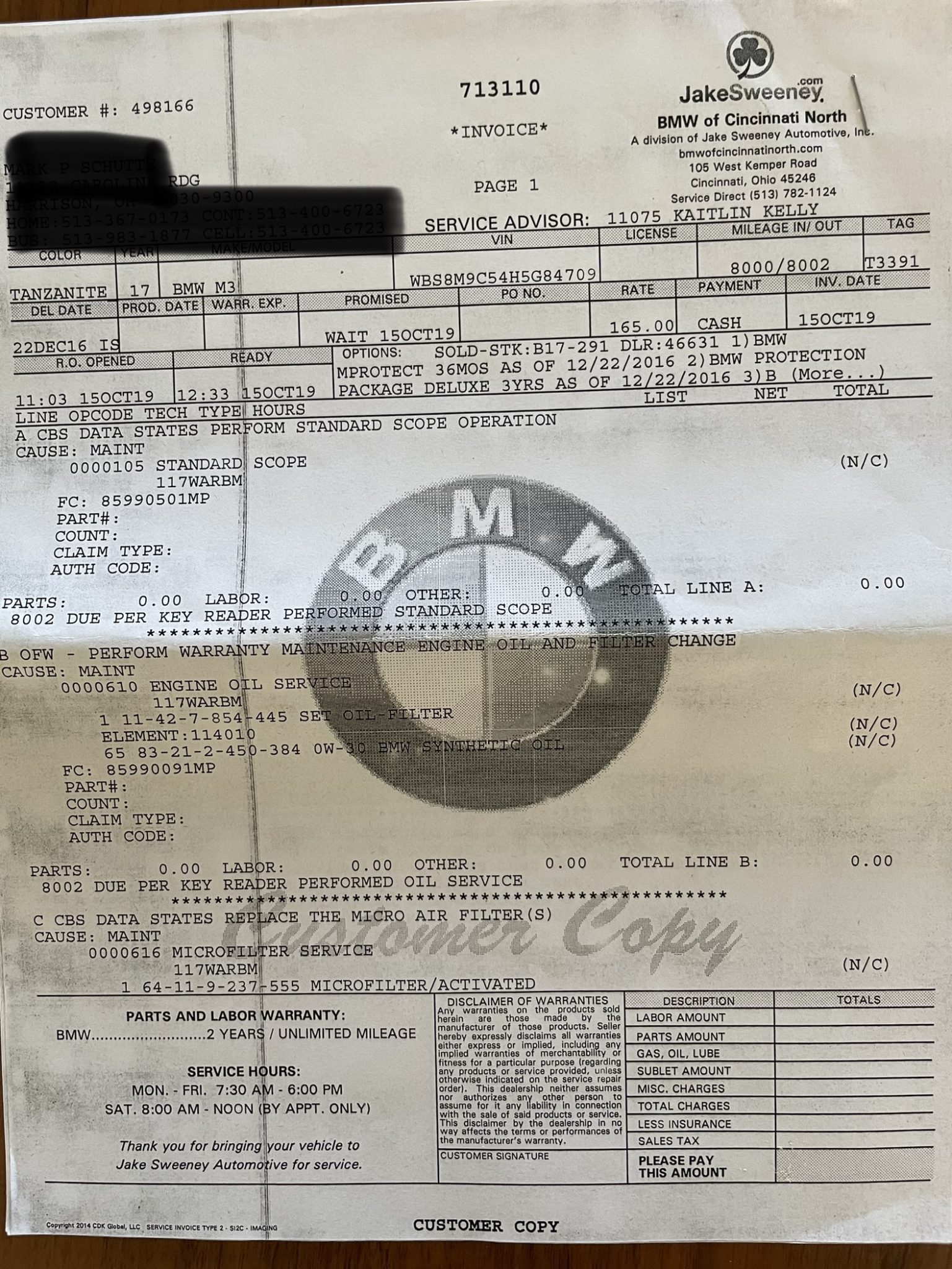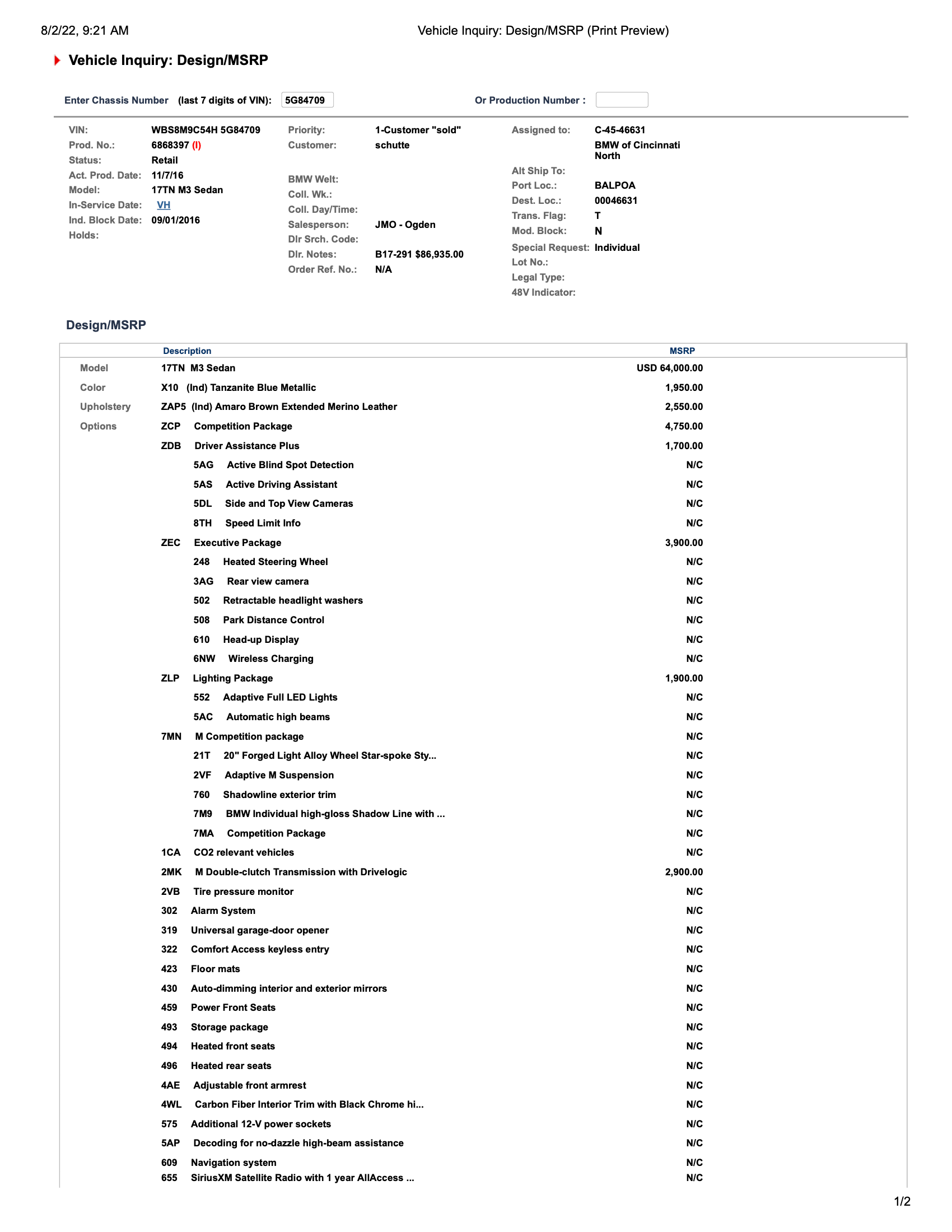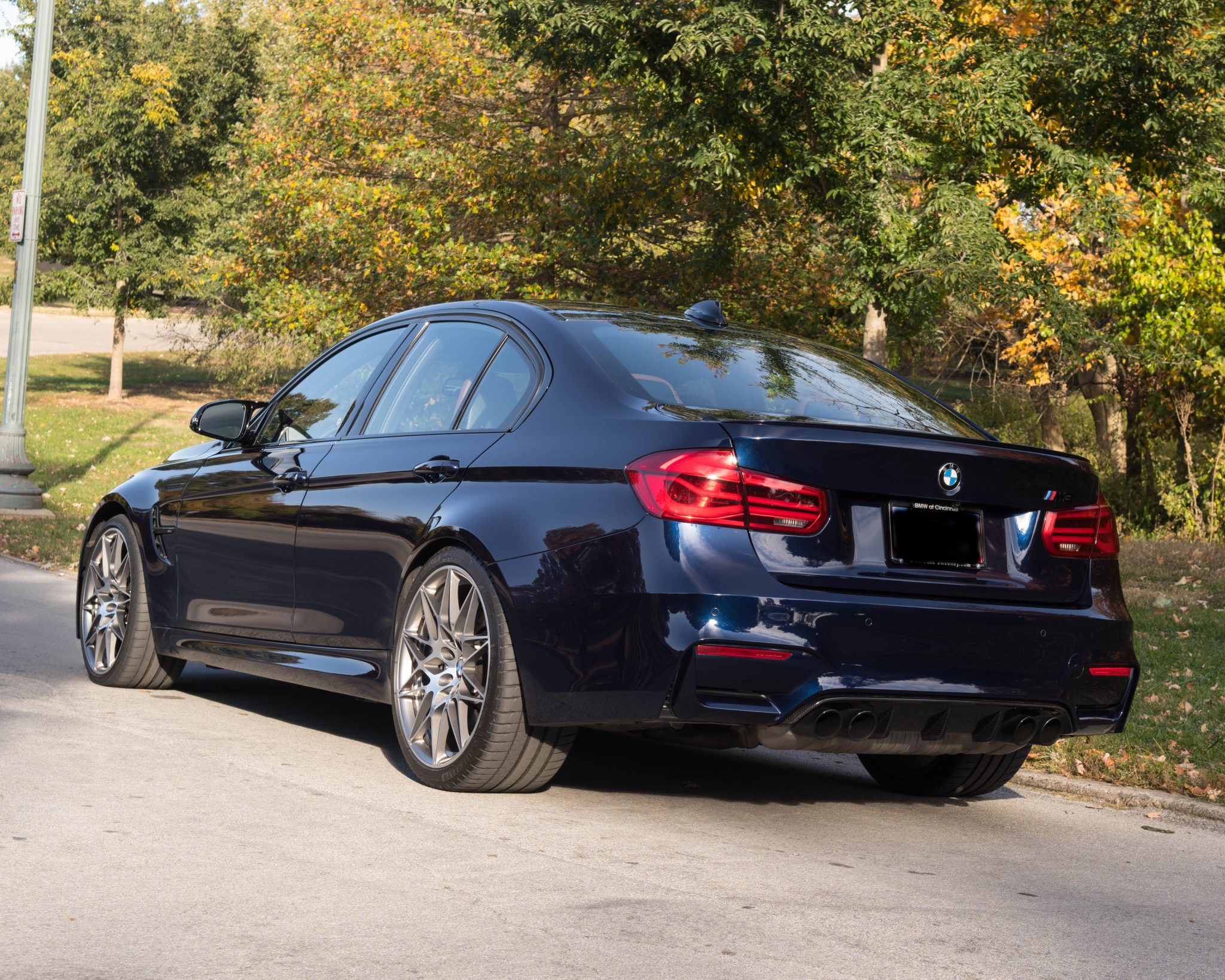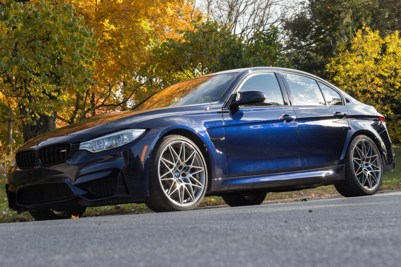 This 2017 BMW M3 is powered by a twin-turbocharged 3.0-liter S55 inline-six mated with a seven-speed dual-clutch transmission and is finished in Tanzanite Blue Metallic over Amaro Brown individual leather upholstery. Equipment includes the Competition, Executive, and Lighting packages as well as Driver Assistance Plus, Adaptive M suspension, 20″ Style 666M alloy wheels, adaptive LED headlights, dual-zone automatic climate control, heated seats, carbon-fiber interior trim, Harman Kardon audio, and navigation. The car has been registered in Ohio since new and was acquired by the seller in August 2022. The oil was changed and the brake fluid was flushed in December 2021. This F80 M3 has 21k miles and is now offered with manufacturer’s literature, two key fobs, service records, a spare set of rubber floor mats, a clean Carfax report, and a clean Ohio title in the seller’s name. The F80 M3 featured wider bodywork, revised bumper covers, and fender vents when compared to the standard 3-series, and the Competition package added gloss-black Shadowline trim that extended to the kidney and side grilles and rear M4 badging. This example is finished in Tanzanite Blue Metallic and is equipped with the Lighting package’s adaptive LED headlights as well as a carbon-fiber roof panel, front and rear Park Distance Control sensors, a rear spoiler, and quad exhaust tips. A close-up photo showing blemishes on the hood is provided in the gallery below, and the seller states that paint protection film was applied to the front of the car under prior ownership. Factory 20″ Style 666M wheels wear 265/30 front and 285/30 rear Michelin Pilot Super Sport 4S tires. The Competition package included a quicker steering ratio, stiffer springs and anti-roll bars, and revised settings for the Adaptive M suspension. Braking is provided by blue-finished M-logo calipers mounted over cross-drilled and ventilated rotors, and the brake fluid was flushed in December 2021. The heated and power-adjustable front seats and the heated rear bench are upholstered in Amaro Brown Merino leather with M-logo badges on the front seatbacks, and carbon-fiber trim accents the dashboard and center console. The optional Executive and Driver Assistance Plus packages added a heated steering wheel, a head-up display, and side and top-view cameras for Park Distance Control. Additional amenities include dual-zone automatic climate control, Comfort Access keyless entry, a Harman Kardon surround sound system, and iDrive infotainment with navigation. A heated M sport multifunction steering wheel with paddle shifters frames a 200-mph speedometer, an 8,500-rpm tachometer, and gauges for fuel level and coolant temperature. The digital odometer indicates 21k miles, approximately 2k of which were added under current ownership. The twin-turbocharged 3.0-liter S55 inline-six was factory rated at 444 horsepower and 406 lb-ft of torque in Competition specification. The oil was changed in December 2021. Power is sent to the rear wheels through a seven-speed dual-clutch automatic transmission and an electronically-controlled Active M differential. Manufacturer’s literature and two key fobs as well as spare rubber floor mats and service records are included in the sale. The Carfax report shows no accidents or other damage and lists history in Ohio since new.