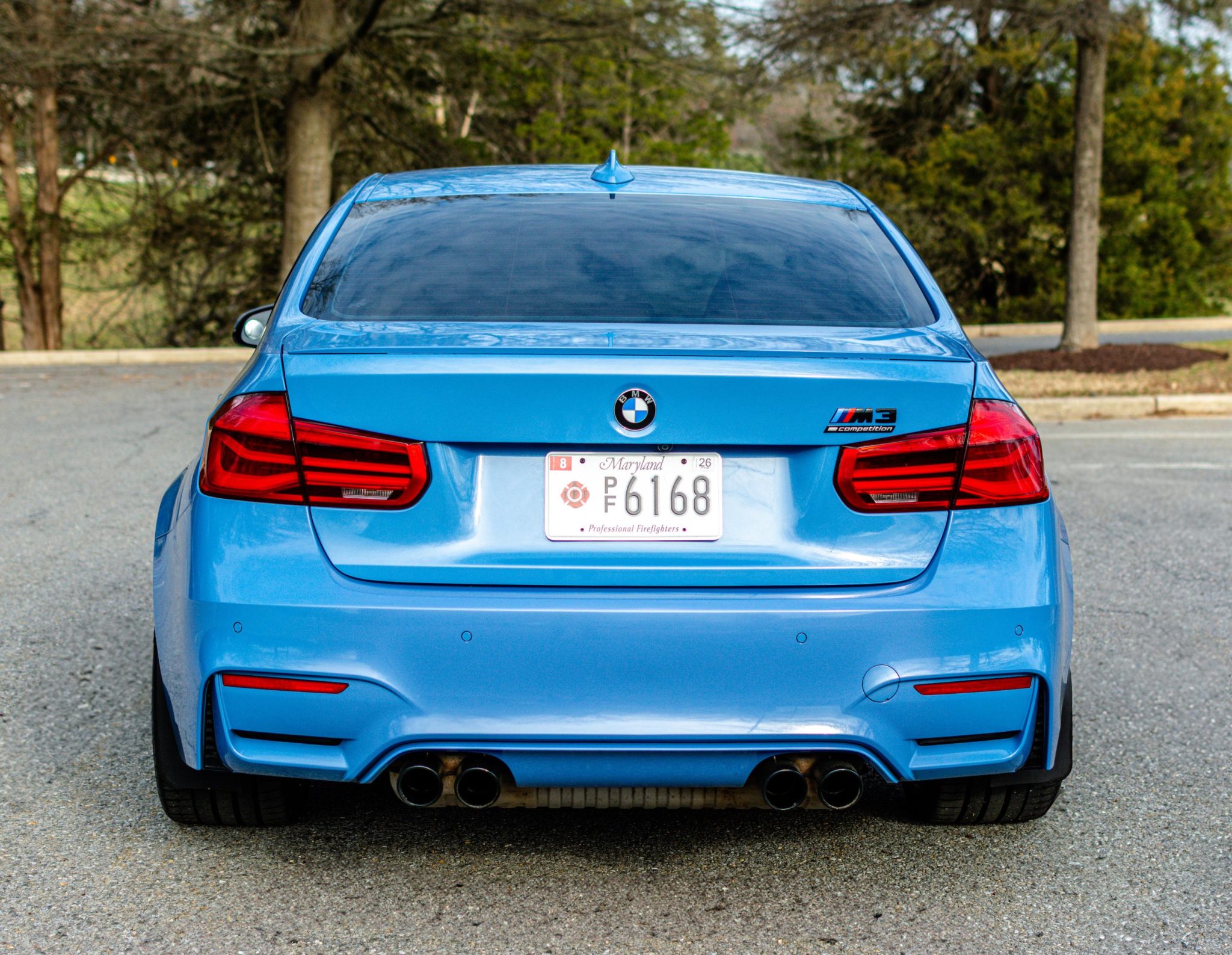 This 2017 BMW M3 is a Yas Marina Blue Metallic-finished sedan that has 41k miles through the seller’s purchase in 2020, and it was optioned from the factory with the Executive and Competition packages as well as a six-speed manual transmission. Powered by a twin-turbocharged 3.0-liter S55 inline-six, the car is further equipped with black full Merino leather upholstery, an Active M differential, 20″ Style 666M alloy wheels, adaptive xenon headlights, a sunroof, heated front and rear seats, a heated steering wheel, side- and top-view cameras, a head-up display, Park Distance Control, carbon-fiber interior trim, a Harman Kardon sound system, Comfort Access keyless entry, and navigation. This F80 M3 is now offered with a window sticker, the owner’s manual, service records, a clean Carfax report, and a clean Maryland title in the seller’s name. The F80 M3 featured widened bodywork along with revised fender vents and bumpers compared to the standard 3-series, while the Competition Package adds gloss-black kidney grilles, side gills, and rear model badging. This example is finished in Yas Marina Blue Metallic with Shadowline trim and has adaptive xenon headlights with auto-leveling, LED taillights, a sunroof, front and rear Park Distance Control, a rear decklid spoiler, and a sport exhaust system with quad exhaust tips. Paint chips are noted on the front end. The 20″ Style 666M alloy wheels wear Michelin tires that were mounted in preparation for the sale. The Competition package included a quicker steering ratio, stiffer springs and anti-roll bars, and revised settings for the Adaptive M Suspension system and stability control. Braking is handled by blue-finished M-branded calipers fitted over cross-drilled and ventilated rotors at all four corners. The cabin features seating surfaces upholstered in black Merino leather that extends to the dash, center console, and door panels. Carbon-fiber trim accents the interior, and additional appointments include heated power-adjustable lightweight front sport seats, heated rear seats, side- and top-view cameras, a head-up display, Comfort Access keyless entry, a Harman Kardon sound system, dual-zone automatic climate control, cruise control, and iDrive infotainment with navigation. The heated leather-wrapped multifunction steering wheel frames a 200-mph speedometer, an 8,500-rpm tachometer, and gauges for oil temperature and fuel level. The digital odometer indicates 41k miles, approximately 11k of which were added under current ownership. The twin-turbocharged 3.0-liter S55 inline-six was factory rated at 444 horsepower and 406 lb-ft of torque. An oil change was performed in March 2025. Power is sent to the rear wheels through a six-speed manual transmission and an electronically controlled Active M differential. Additional photos of the underside are provided in the gallery. The window sticker shows initial delivery to Princeton BMW of Hamilton, New Jersey, along with factory colors, equipment, options, and a total suggested retail price of $77,745. The Carfax report is free of accidents or other reported damage.