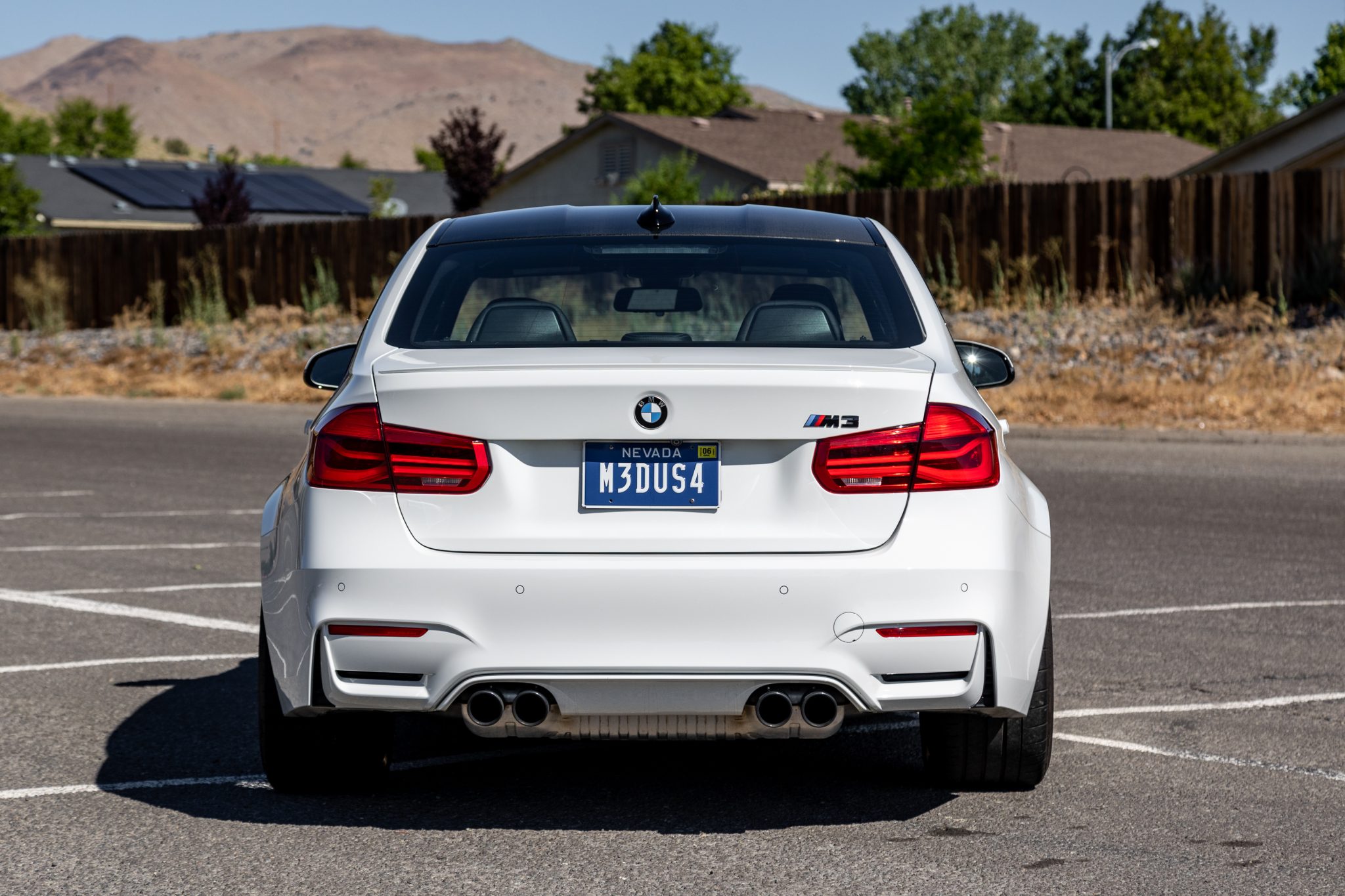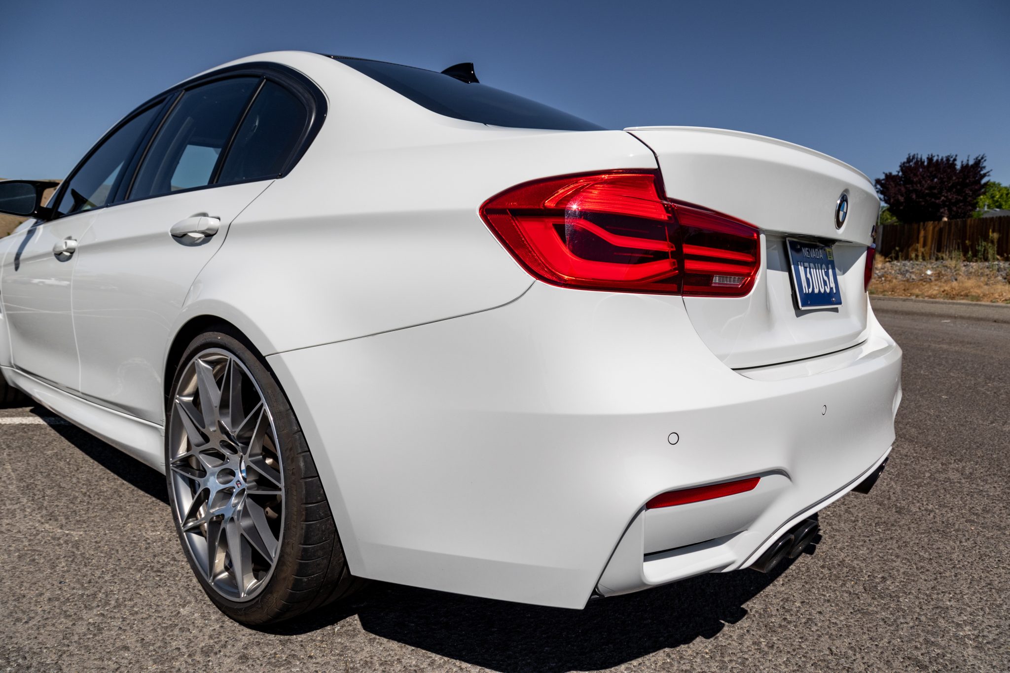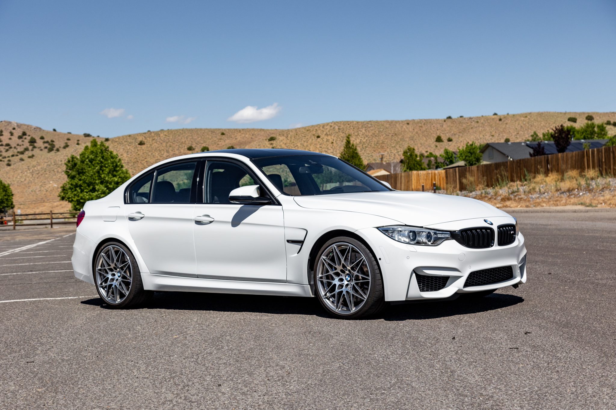 This 2017 BMW M3 is a Competition Package sedan that was delivered new to BMW of Concord, California, and was acquired by the seller in May 2018. It is finished in Alpine White over black extended Merino leather upholstery and powered by a twin-turbocharged 3.0L inline-six mated to a seven-speed DCT automatic transmission. Equipment includes an adaptive M suspension, 20″ style 666M wheels, dynamic xenon headlights, Driver Assistance Plus, Comfort Access, Park Distance control, heated front and rear seats, four-zone automatic climate control, a power rear sunshade, a Harman Kardon surround sound system, and the Executive and Competition packages. A replacement driveshaft was fitted in 2019 and work performed in June 2022 included flushing the brake fluid, changing the oil, and replacing the spark plugs and air filters. This F80 M3 has 28k miles and is offered in Nevada with manufacturer’s literature, a window sticker, two keys, service records, a clean Carfax report, and a clean California title in the seller’s name. The F80 M3 features front fender vents, unique bumpers, and wider bodywork than the standard 3-series. This example is finished in Alpine White (300) with high-gloss Shadowline trim and is equipped with adaptive xenon headlights, rain-sensing windshield wipers, and quad exhaust outlets with black chrome finishers. Paint protection film has been applied to the exterior, and IND painted front reflectors have been installed. The seller notes paint imperfections on the front end in addition to a bubble in the paint protection film located on the trunk. Style 666M 20″ Star Spoke wheels are wrapped in Michelin Pilot Super Sport tires measuring 265/30 up front and 285/30 out back. The car is equipped with an Adaptive M suspension, wheel locks, Dynamic Brake Control, and Dynamic Stability Control. Braking is provided by blue M3-branded calipers over cross-drilled disc brakes at each corner. A brake fluid flush and an alignment were performed in preparation for the sale. The cabin features black Merino leather upholstery on the heated front and rear seats, center console, door panel inserts, and dashboard in addition to carbon-fiber trim and an Anthracite headliner. Amenities include power-adjustable front sport seats, multi-zone automatic climate control, a power rear sunshade, manually-operated rear side window shades, a wireless charging pad, Comfort Acesss, Park Distance Control, navigation, a Harman Kardon sound system, a rear-view camera, and the Driver Assistance Plus package, which added Active Blind Spot Detection, Active Driving Assistant, and side and top-view cameras. A scuff is visible on the hand brake leather. The cabin air filter was replaced in 2022. A multifunction M sport steering wheel frames a 200-mph speedometer, an 8,500-rpm tachometer with a variable redline, a central display screen, and auxiliary gauges. The digital odometer indicates 28k miles, approximately 9k of which have been added under current ownership. The Competition Package increased output of the twin-turbocharged 3.0L S55 inline-six to 444 horsepower and 406 lb-ft of torque in stock trim. A replacement driveshaft was fitted in 2019, and work completed in preparation for the sale includes replacing the spark plugs and air filters in addition to performing an oil change. Power is delivered to the rear wheels through a seven-speed dual-clutch automatic transmission with automatic and manual modes. A sport exhaust system was factory equipped. The window sticker shows initial delivery to BMW of Concord, California, along with factory colors, options, and a total suggested retail price of $78,970. The Carfax report shows no accidents or damage and displays history in California and Nevada.