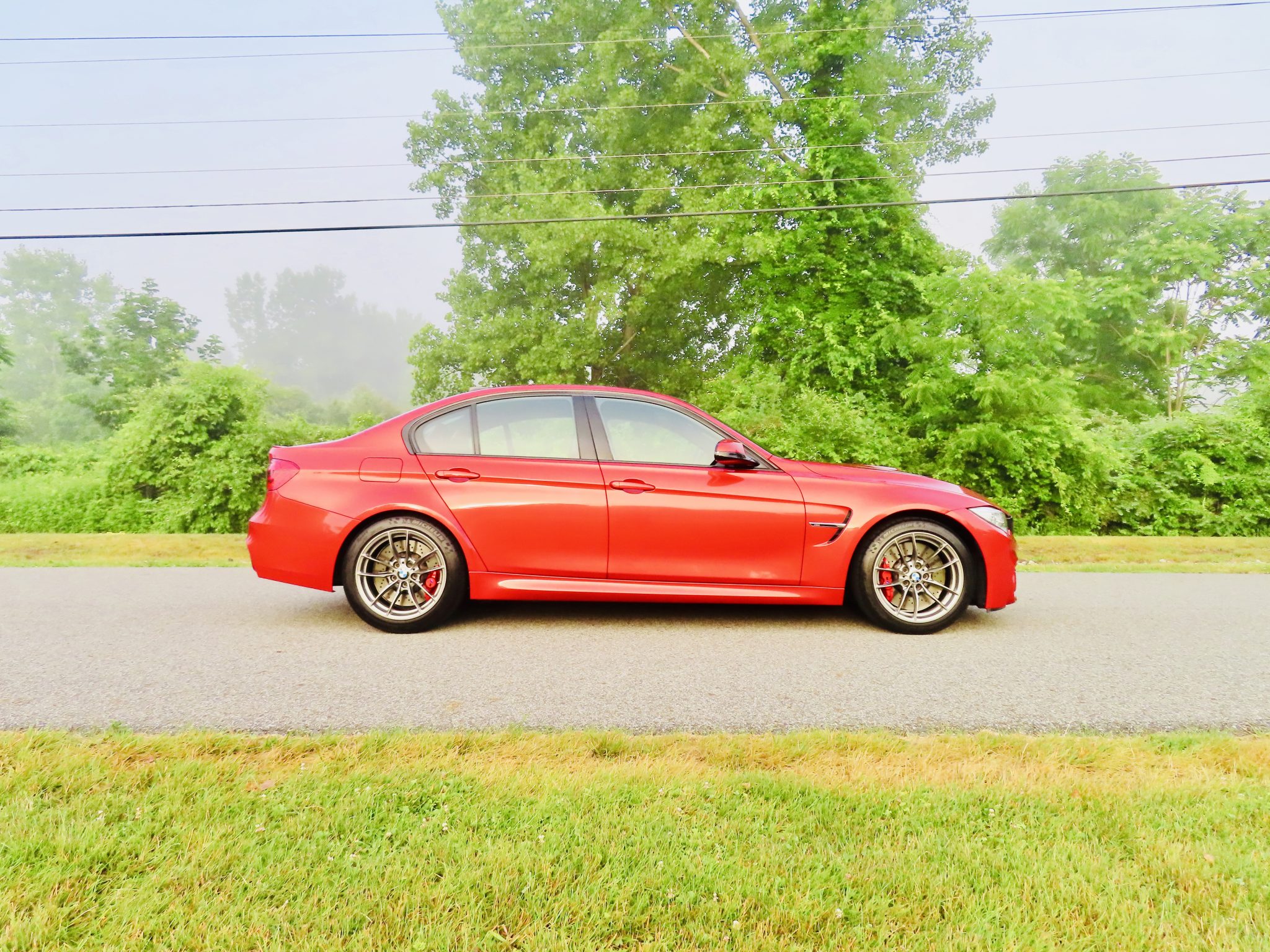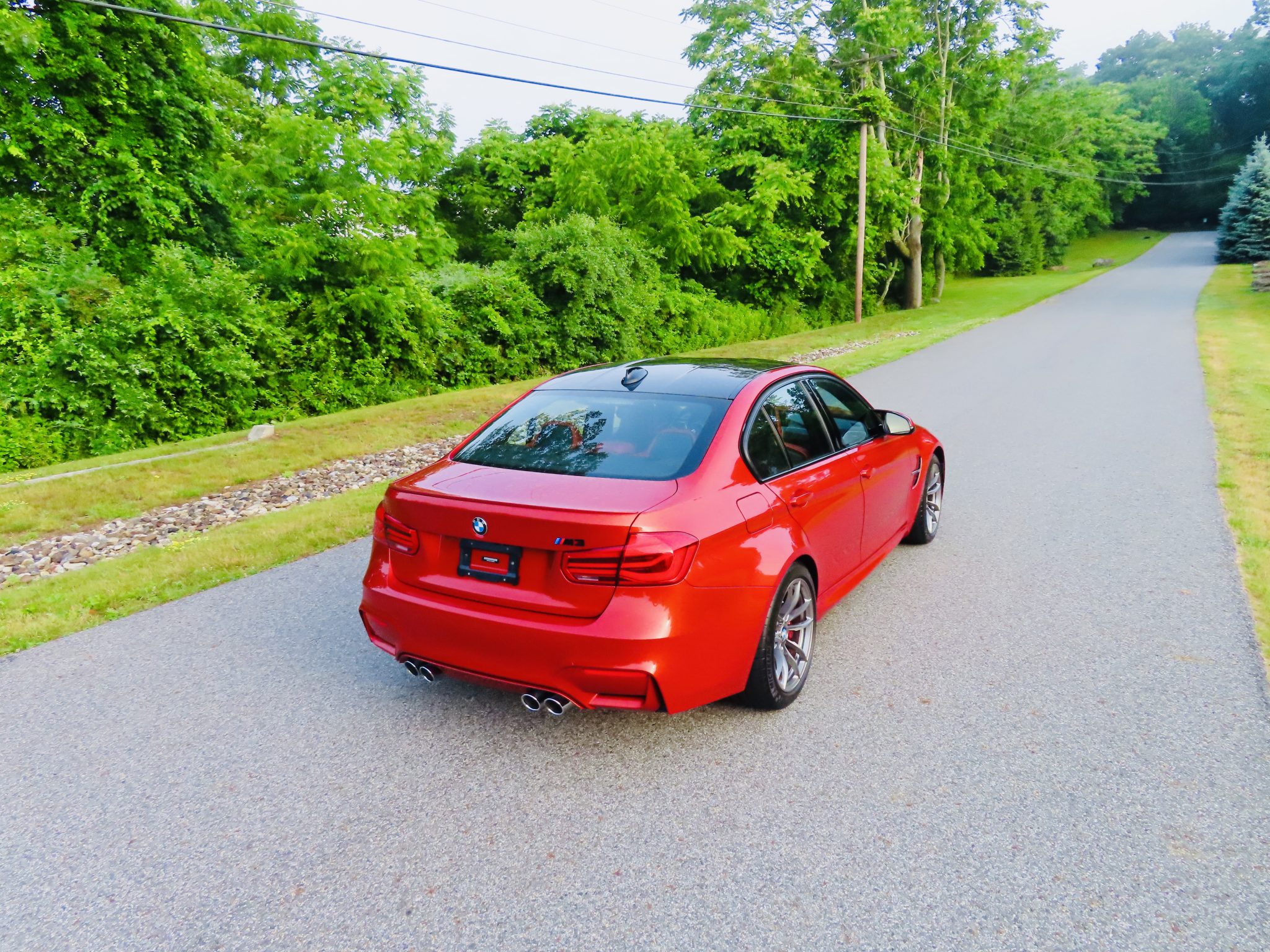 This 2017 BMW M3 was leased by its first registered owner in New York, and it was acquired by the selling dealer in May 2020 with just over 20k miles. The car is finished in Sakhir Orange II Metallic over Sakhir Orange and black extended leather, and it is powered by a twin-turbocharged 3.0L S55 inline-six paired with a six-speed manual transmission. Equipment includes front and rear heated seats, a heated steering wheel, WiFi hotspot, adaptive LED headlights, rain-sensing windshield wipers, Adaptive M Suspension, and Park Distance Control. Service in March 2020 included a brake fluid flush, an oil change, and replacement of a ball joint, front axle wishbone, and spark plugs. This F80 M3 is now offered in New York with a Davis report, a clean Carfax report, and a clean Pennsylvania title. The F80 M3 features fender vents, unique bumpers, and wider bodywork than the standard 3-series. This example is finished in Sakhir Orange II Metallic (C1H) with Shadowline trim and features a carbon fiber roof panel, an aluminum hood, and aluminum front fenders, along with adaptive LED headlights, rain-sensing windshield wipers, and Park Distance Control. The Carfax report shows no accidents or other damage, and photos of paint meter readings are provided in the gallery. Factory 18″ Style 513 wheels are fitted with Michelin Pilot Super Sport tires measuring 255/40 up front and 275/40 out back with 2016 date codes. Service in March 2020 included a brake fluid flush and replacement of a ball joint and the front axle wishbone. The cabin is upholstered in Sakhir Orange with black Merino extended leather (LKDA), with matching door panels, a black leather-covered dashboard, and black carpets. Additional features include carbon fiber trim with black chrome accents, heated front and rear seats, WiFi hotspot, a head-up display, a backup camera, a Harman Kardon surround sound system, and more. The heated multi-function steering wheel frames factory instrumentation including a 200-mph speedometer, an 8,500-rpm tachometer, and a configurable digital display. The digital odometer shows just over 20k miles, a handful of which were added by the selling dealer. A driving video can be viewed above. The twin-turbocharged 3.0L S55 inline-six is factory-rated at 425 horsepower and 406 lb-ft of torque, which is sent to the rear wheels through a six-speed manual transmission. Service in March 2020 included an oil change and replacement of the spark plugs and engine air filter. Additional underside photos can be viewed in the gallery. The June 2020 Carfax report lists no accidents or other damage and shows history in New York and New Jersey from a single registered owner. An exterior walk-around video is provided above, while a video featuring engine bay and interior details can be viewed below.