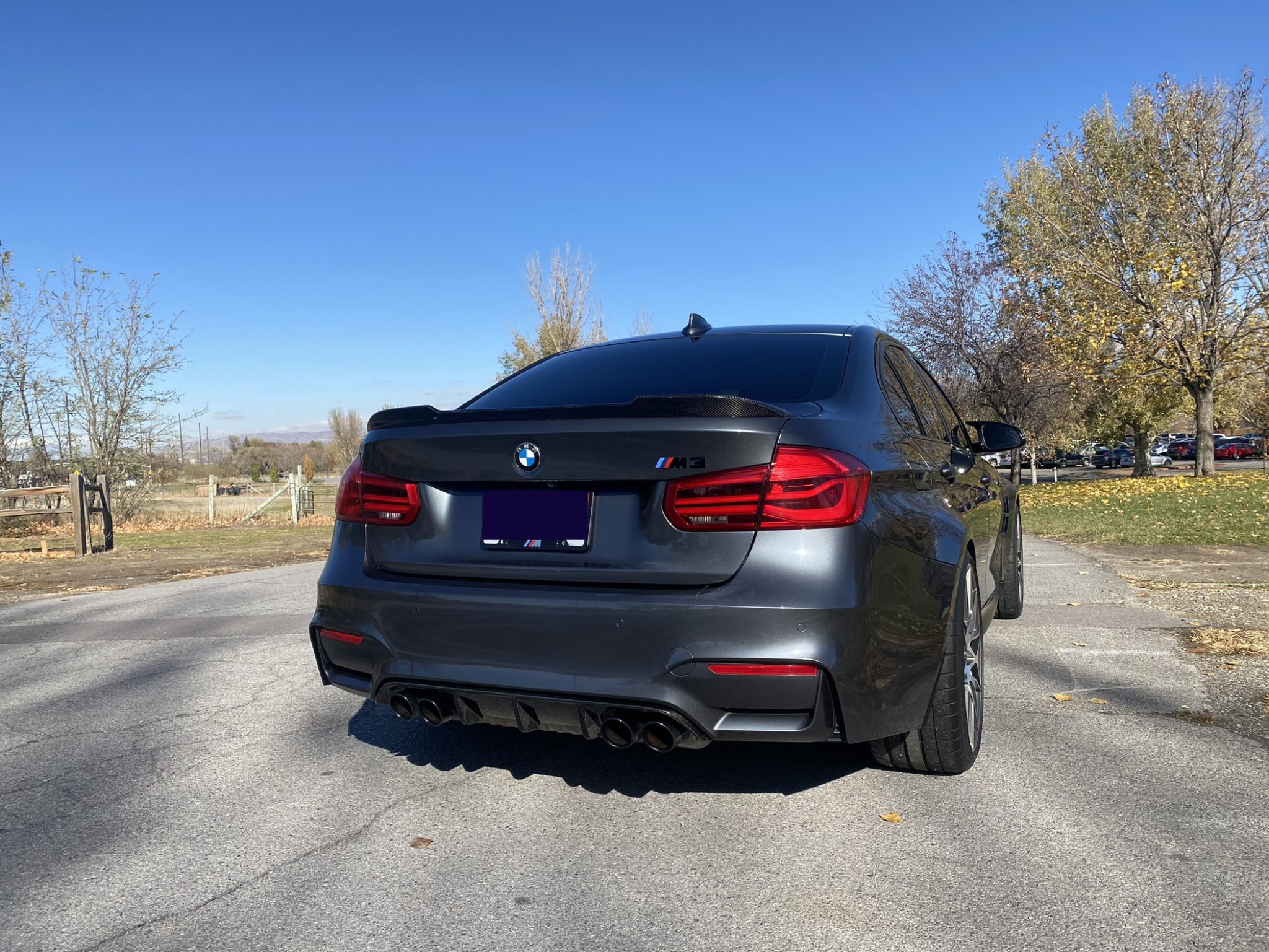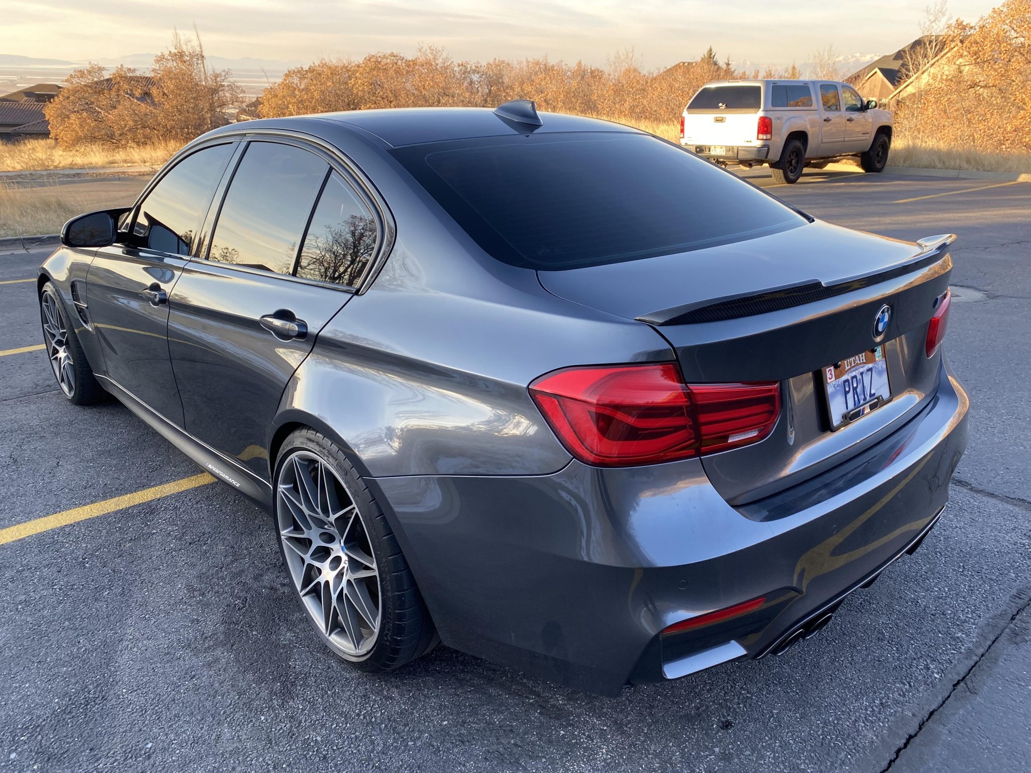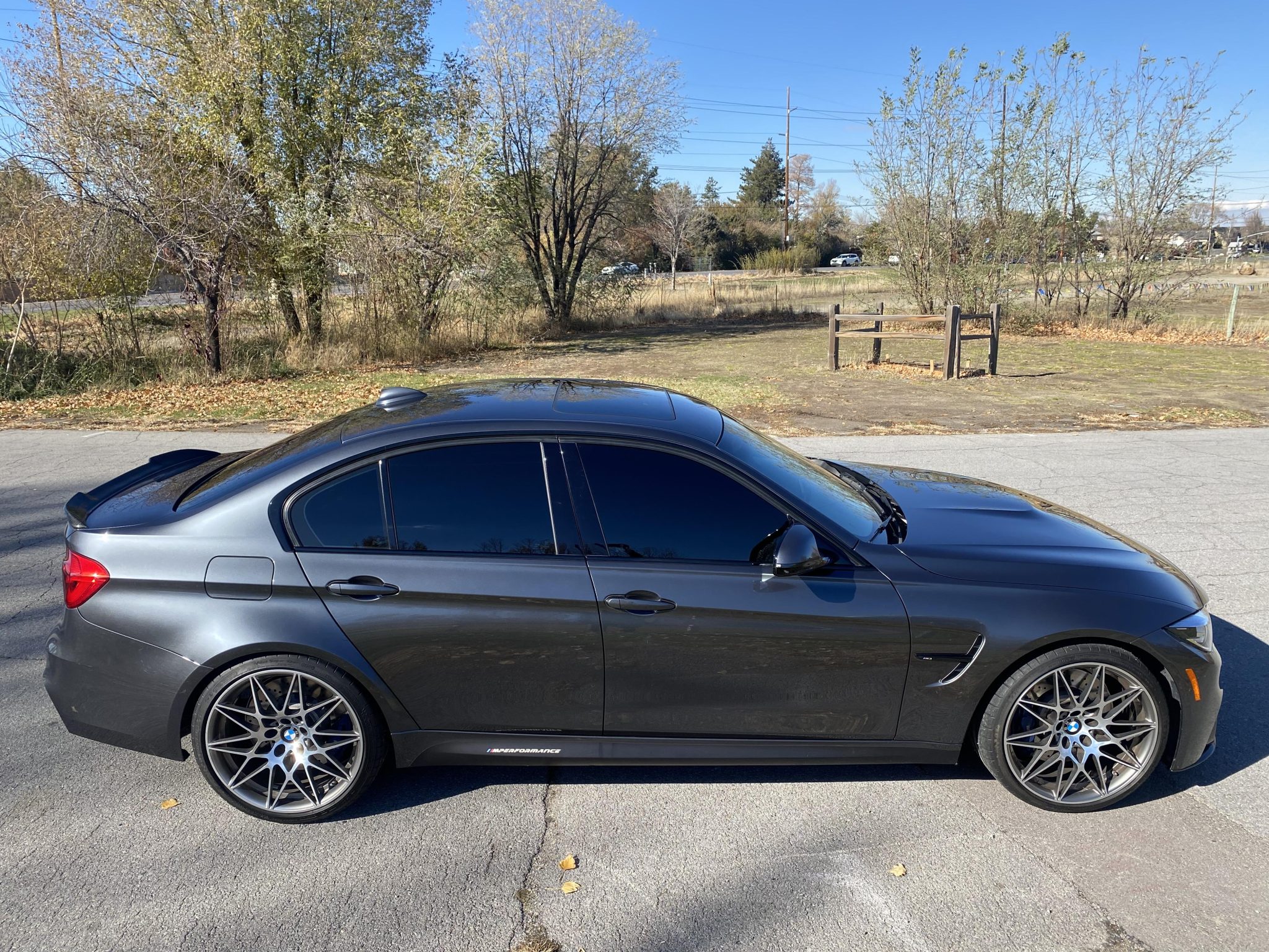 This 2018 BMW M3 sedan is powered by a twin-turbocharged 3.0-liter S55 inline-six paired with a six-speed manual transmission and is finished in Mineral Gray Metallic over Sakhir Orange Merino leather upholstery. Equipment includes the Competition Package, an Active M differential, a sunroof, 20″ Style 666M wheels, front and rear parking sensors, a backup camera, a rear spoiler, heated power-adjustable front seats, carbon-fiber interior trim, a CD stereo, and navigation. The car spent time in California, Arizona, and Oregon prior to being purchased by the seller in 2021. Service under current ownership consisted of flushing the brake fluid, changing the oil, and replacing the spark plugs, rear differential bushing, VDM control unit, right-front strut and spring, cabin air filter, and front lip spoiler. This F80 M3 is now offered with partial service records, two keys, a Carfax report, and a clean Utah title in the seller’s name. The F80 M3 featured widened bodywork along with revised fender vents and bumpers compared to the standard 3-series, while the Competition Package adds gloss-black kidney grilles, side gills, and rear model badging. This example is finished in Mineral Gray Metallic with Shadowline trim and features xenon headlights, a sunroof, LED taillights, a carbon-fiber rear decklid spoiler, and a sport exhaust system with quad exhaust tips. Paint protection film has reportedly been applied to the exterior, and a replacement front lip spoiler was fitted in October 2022. Blemishes are visible on the front end. The 20″ Style 666M wheels are mounted with Michelin Super Pilot Sport tires measuring 265/30 up front and 285/30 at the rear. The Competition package included a quicker steering ratio, stiffer springs and anti-roll bars, and revised settings for the Adaptive M Suspension system and stability control. Braking is handled by blue-finished M-branded calipers fitted over cross-drilled and ventilated rotors at all four corners. The left-front wheel is cracked, curb damage is located on the left-rear wheel, and an August 2019 entry of the Carfax report lists a structural alteration, which the seller notes is related to a lowered suspension installed under prior ownership that has since been returned to stock with stock springs during current ownership according to the seller. The right-front strut and spring were replaced in April 2022, and a brake fluid flush was performed in October 2022. The cabin features seating surfaces upholstered in Sakhir Orange Merino leather along with carbon-fiber trim on the dashboard and center console. Rubberized floor mats line the footwells, and additional appointments include heated power-adjustable front sport seats, Comfort Access keyless entry, a CD stereo, dual-zone automatic climate control, cruise control, and iDrive infotainment with navigation. A set of carpeted floor mats is included in the sale. The cabin air filter was replaced in April 2022. The leather-wrapped multifunction steering wheel frames a 200-mph speedometer, an 8,500-rpm tachometer, and gauges for oil temperature and fuel level. The digital odometer indicates 25k miles, approximately 8k of which were added under current ownership. The twin-turbocharged 3.0-liter S55 inline-six was factory rated at 444 horsepower and 406 lb-ft of torque in Competition specification. The spark plugs were replaced in April 2021, and service in 2022 included changing the oil and replacing the VDM control unit. Power is sent to the rear wheels through a six-speed manual transmission and an electronically controlled Active M differential. A replacement rear differential bushing was installed in January 2022, and additional photos of the underside are presented in the gallery. The Carfax report shows the aforementioned structural alteration in August 2019 and lists history in California, Arizona, Oregon, and Utah.