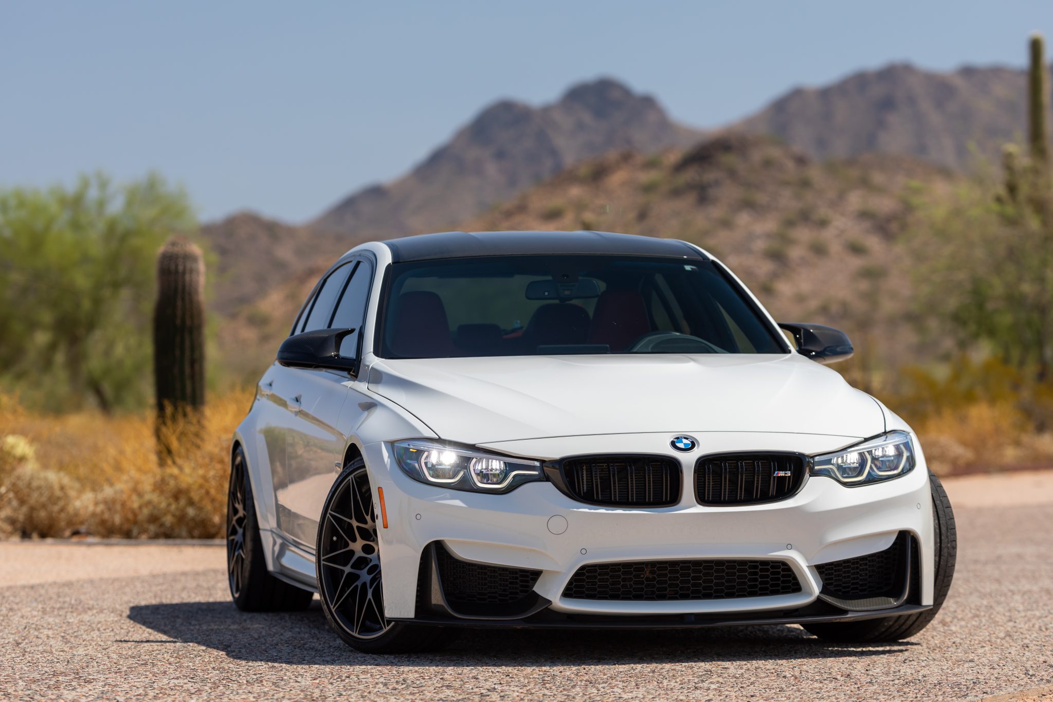 This 2018 BMW M3 sedan was optioned from the factory with the Competition and Executive packages, and it has been fitted with an Injen Technology intake, Eibach springs, and aftermarket exhaust components. Powered by a twin-turbocharged 3.0-liter S55 inline-six paired with a six-speed manual transmission, the car has 17k miles and is finished in Alpine White over Sakhir Orange Merino leather upholstery. It is further equipped with an Active M differential, 20″ Style 666M alloy wheels, adaptive LED headlights, heated front and rear seats, a heated steering wheel, side- and top-view cameras, carbon-fiber exterior and interior accents, a head-up display, Park Distance Control, a Harman Kardon sound system, Comfort Access keyless entry, and navigation. This F80 M3 was purchased by the seller in 2022 and is now offered with two keys, partial service records, a clean Carfax report, and a clean Arizona title in the seller’s name. The F80 M3 featured widened bodywork along with revised fender vents and bumpers compared to the standard 3-series, while the Competition Package adds gloss-black kidney grilles and side gills. This example is finished in Alpine White with Shadowline trim and has adaptive LED headlights, side- and top-view cameras, Park Distance Control, LED taillights, quad exhaust tips, and a carbon-fiber roof, rear spoiler, rear diffuser, front winglets, and mirror caps. The 20″ Style 666M alloy wheels are mounted with staggered-width Michelin tires. The Competition package included a quicker steering ratio, stiffer anti-roll bars, and revised settings for the Adaptive M Suspension system and stability control. Braking is handled by blue-finished M-branded calipers fitted over cross-drilled and ventilated rotors at all four corners. Eibach lowering springs have been fitted. The cabin features seating surfaces upholstered in Sakhir Orange Merino leather along with carbon-fiber trim on the dashboard and center console. Additional appointments include heated power-adjustable lightweight front sport seats, heated rear seats, a head-up display, an M Performance shift knob and pedal covers, Comfort Access keyless entry, a Harman Kardon sound system, dual-zone automatic climate control, cruise control, and iDrive infotainment with navigation. The heated leather-wrapped multifunction steering wheel frames a 200-mph speedometer, an 8,500-rpm tachometer, and gauges for oil temperature and fuel level. The digital odometer indicates 17k miles, approximately 3k of which were added under current ownership. The twin-turbocharged 3.0-liter S55 inline-six has been fitted with an Injen Technology air intake system. An oil change was performed in July 2023. Power is sent to the rear wheels through a six-speed manual transmission and an electronically controlled Active M differential. Aftermarket exhaust components have been fitted, and the seller states the secondary catalytic converters have been removed. The Carfax report is free of accidents or other reported damage.
